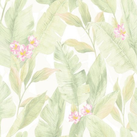 Papel pintado 2951, en color verde, rosa, amarillo y fondo blanco, de la colección Amazonia II de Kemen Wallcoverings.