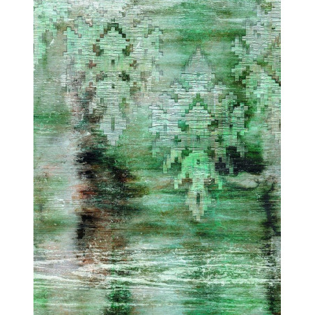 Fotomural mate de estilo boho chic con influencia colonial, en el que podemos ver, un fondo que imita a una vieja pared estucada en tono gris, verde y marrón, sobre el que destaca un dibujo simétrico con ligero relieve óptico, que simula ladrillos grises dispuestos en patrón geométrico que recuerda a las formas de las alfombras asiáticas.