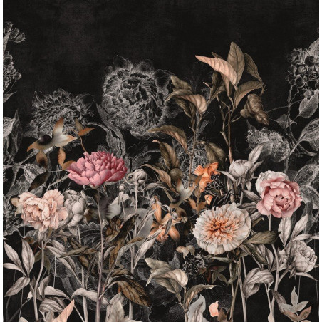 Fotomural mate de estilo barroco clásico, en el que podemos ver, sobre fondo negro, un dibujo al pastel de flores multicolor en primer plano, y un boceto de siluetas de flores dibujadas con tiza.