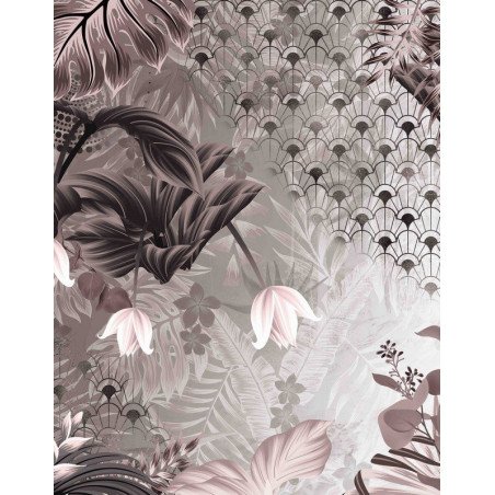 Fotomural mate con influencia art decó y chinoiserie, en el que podemos ver, sobre fondo gris piedra, un patrón geométrico gris oscuro y flores rosa muy claro con grandes hojas en gris claro.