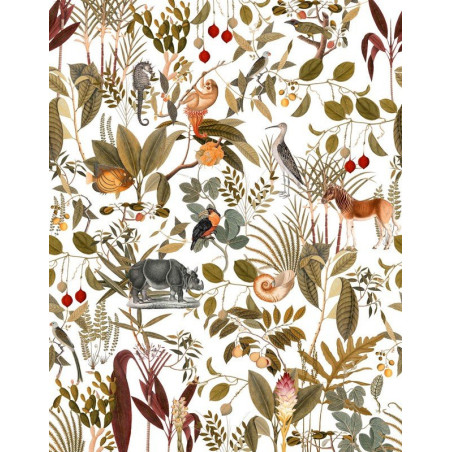 Fotomural mate de estilo primitivista moderno, en el que podemos ver, sobre fondo blanco, un dibujo multicolor de hojas y animales que recuerda a las pinturas de Henri Rousseau.