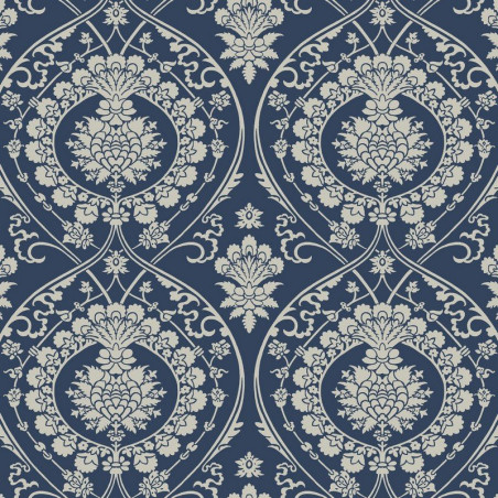Papel pintado DM4901 Imperial Damask en color azul marino y plata de la colección Damask Resource Library de York Wallcoverings.