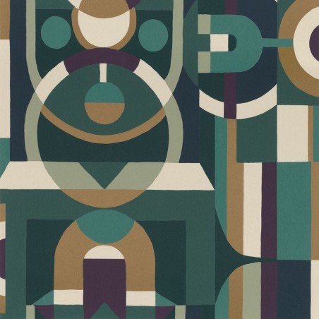 Papel pintado 76250610 Vitrail, en color esmeralda, salvia y berenjena. De la colección Faubourg des Lumieres de Casamance.