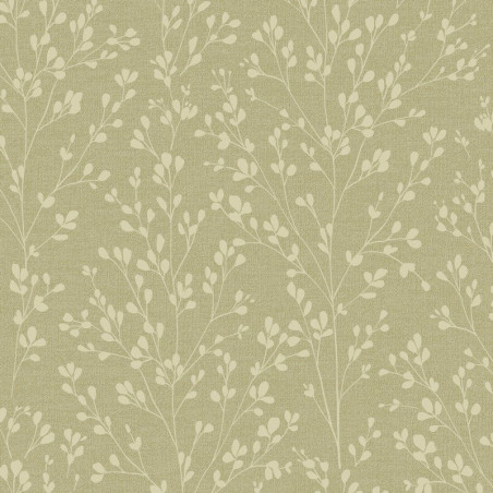 Papel pintado textura textil imitando una chenilla mate en color beige verdoso, con dibujo en bajorrelieve de hojas y ramas en color crema nacarado.