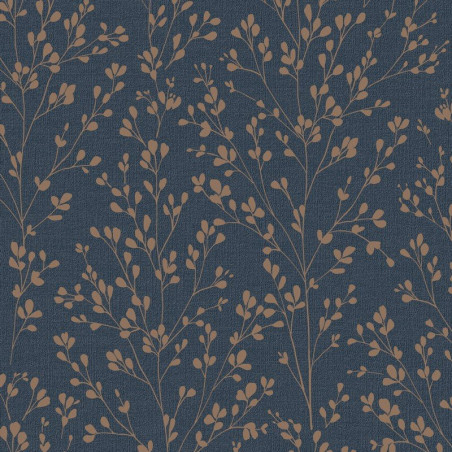 Papel pintado textura textil imitando una chenilla mate en color azul vaquero oscuro, con dibujo en bajorrelieve de hojas y ramas en color cobre metalizado.