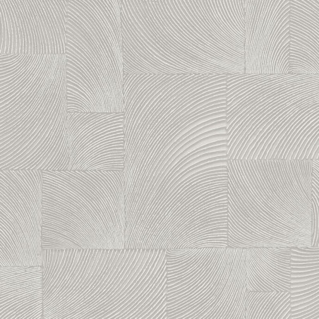 Papel pintado con cuadrados y rectángulos imitación madera en color gris piedra y betas con ligero relieve en color blanco, formando un mosaico de textura orgánica.