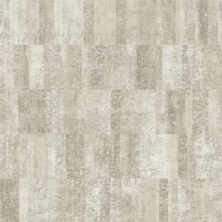 Papel pintado textura textil imitando hilo mate con estampado difuso de rectángulos geométricos en color gris piedra y blanco.