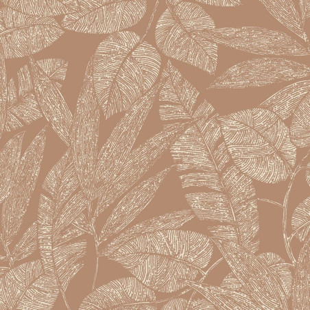 Papel pintado con bajorrelieve de hojas en color blanco mate, sobre fondo plano en color terracota mate.