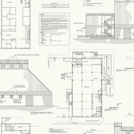 Papel pintado con plano en dibujo lineal en tonos blanquecinos con trazos en negro y gris del fabricante York Wallcoverings
