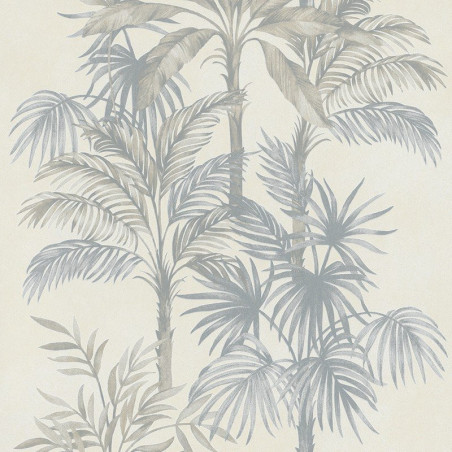 Papel pintado que imita a una pared de arenisca mate, con mínimo relieve de puntitos en color blanco roto con un matiz de salmón muy claro. El revestimiento tiene un dibujo bajorrelieve de palmeras con hojas románticas, como pintadas en acuarela (sin textura) en color gris y beige. Un papel de pared colonial donde la selva proporciona a cualquier pared personalidad y frescura actual.