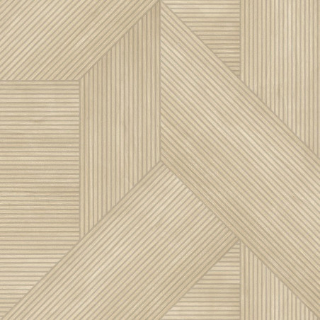 Papel pintado RE25180, con dibujo de taracea geométrica alistonada, en color beige y arena, de la colección Reflect de Iberostil.